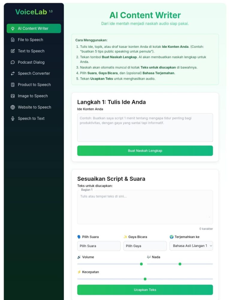 Dengan VoiceLab, Anda punya asisten kreatif digital yang membantu menulis, menyuarakan, dan menyempurnakan konten secara instan.